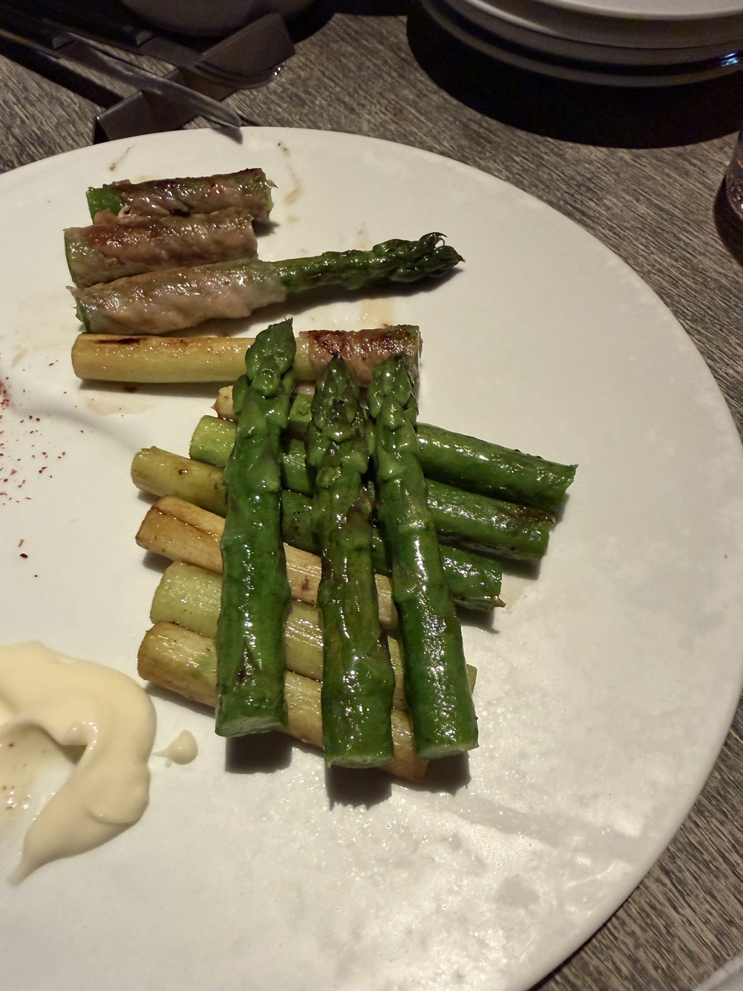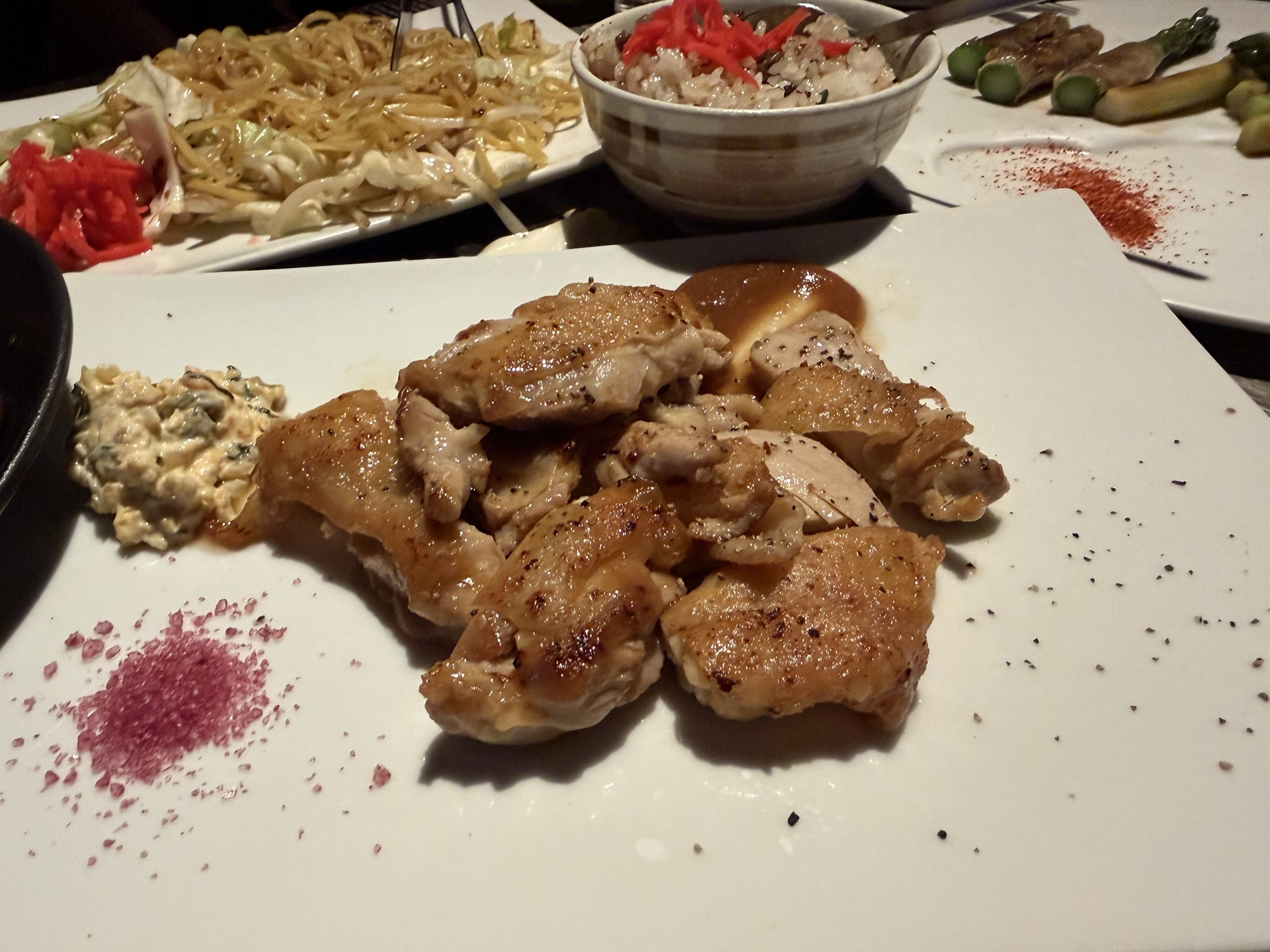 We got the sirloin beef, chicken, mushrooms, fried rice, and some noodles and beef wrapped asparagus. All were great and I would get them again. For drinks got a glass of sparkling wine.