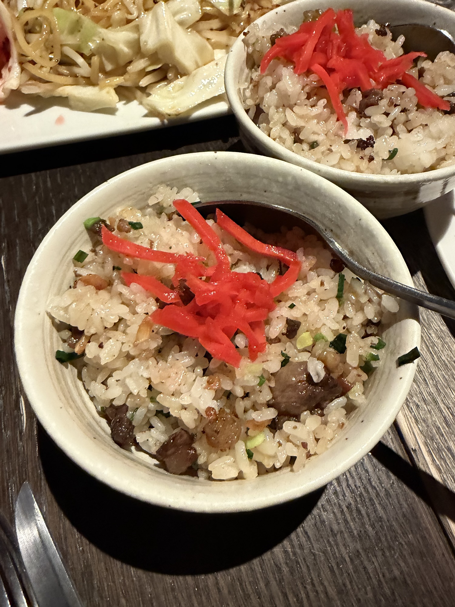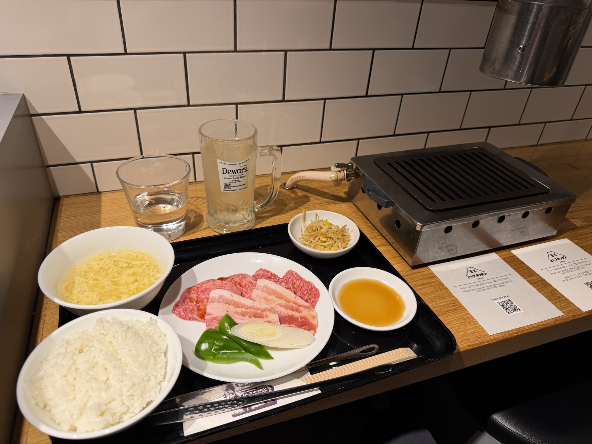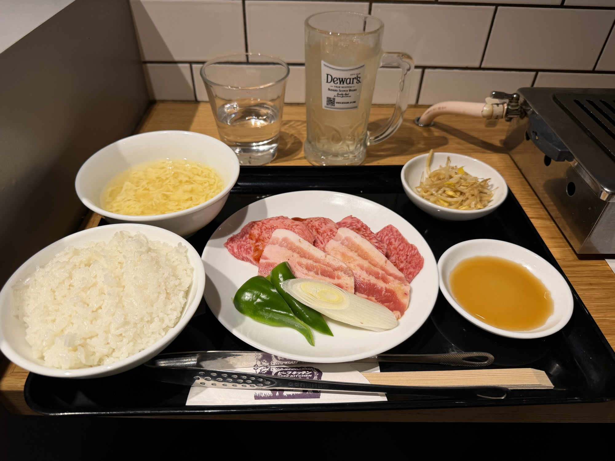 Got the Yakiniki set meal (had beef and pork with egg soup), with a highball of course. Would come back to this place if I was eating along and needed a quick Japanese bbq fix.