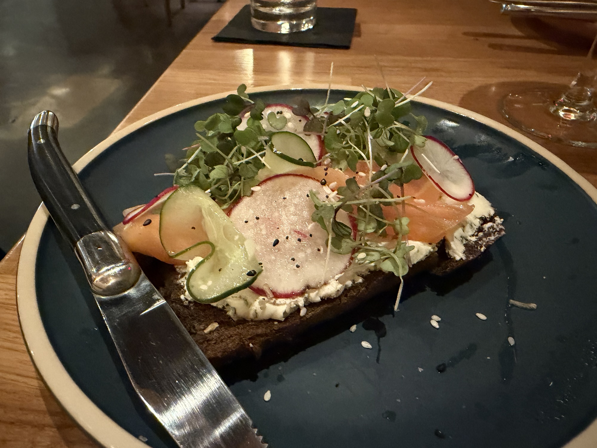 For drinks, got an espresso martini, and a whisky from Israel (92 proof). Espresso martini did the job (nothing to write home about, but could get it again). For the whisky, reminded me a little like Toki, but more alcohol tasting. Would not not get it again.